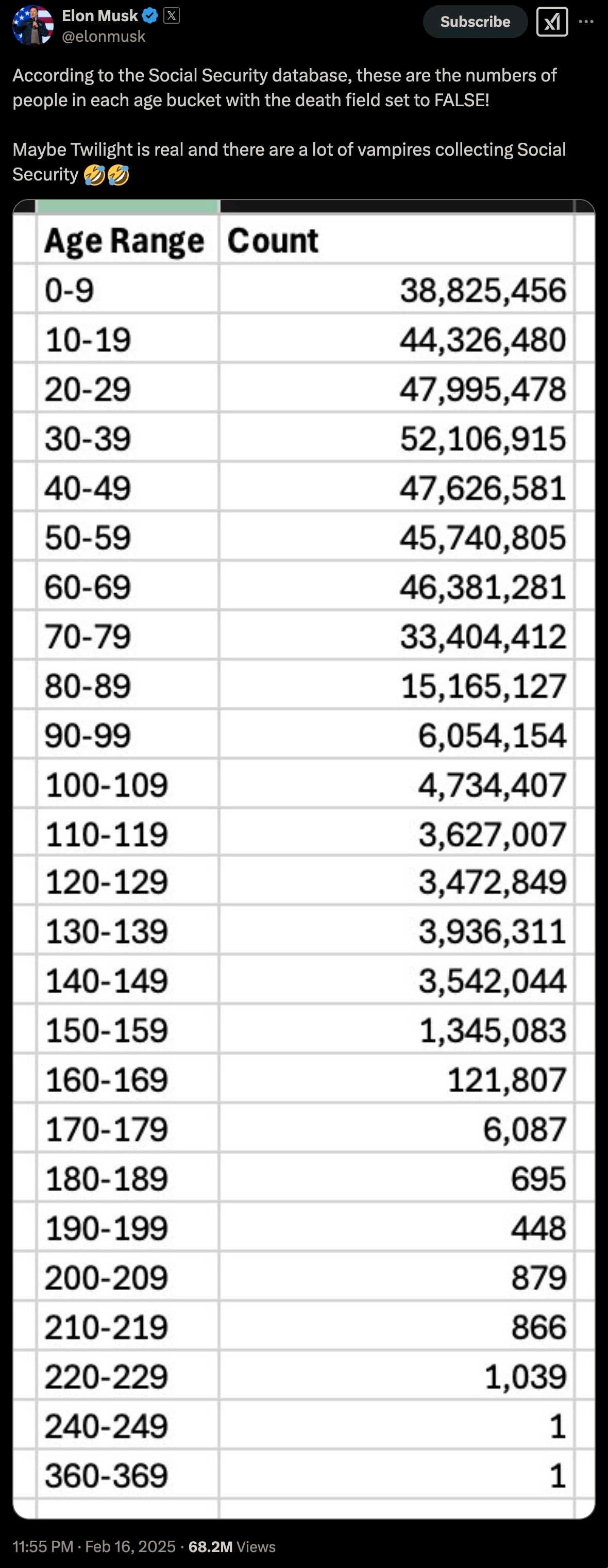Musk also revealed that DOGE is uncovering untold amounts of social security waste, including payments going to millions of people who are all aged over 120, in other words dead.