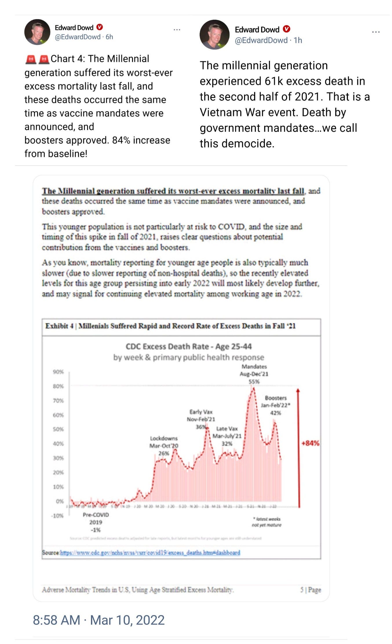 Edward Dowd, former BlackRock analyst, & his team just uncovered raw CDC data that Millennials age 25-44 had 61k excess deaths 2021, +84% baseline. They are NOT at risk for PSYOP-19, so it's DEATHVAX™