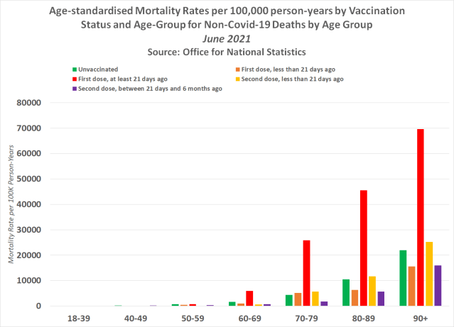 The following chart shows the age-standardised mortality rates per 100,000 person-years by vaccination status and age-group for the month of May 2021 –