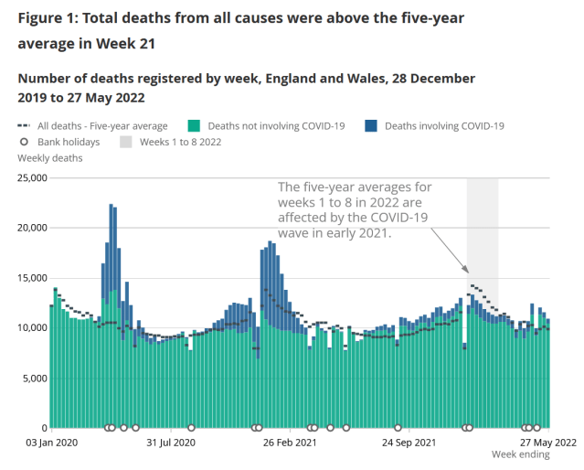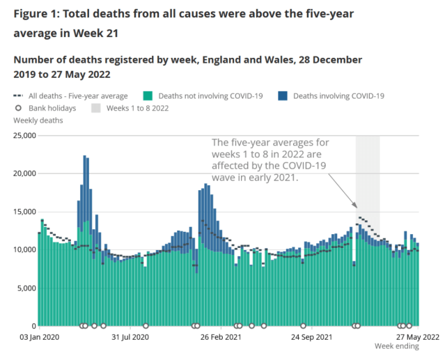 The Office for National Statistics (ONS) publishes weekly figures on deaths registered in England and Wales. The most recent data shows deaths up to 27th May 2022.