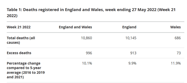 Well, now the latest UK Government data on deaths in England and Wales adds further weight to the above findings because the UK has been experiencing excess deaths again since the end of April 2022. Approximately 5 months after the mass winter “Booster” vaccination campaign.