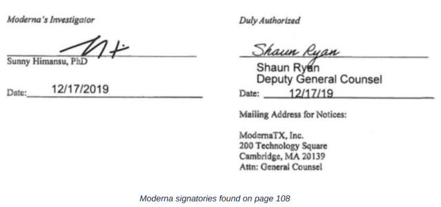 The final signatories of the agreement were Sunny Himansu, Moderna’s Investigator, and Shaun Ryan, Moderna’s Deputy General Counsel. Both signatures were made on December 17th 2019.