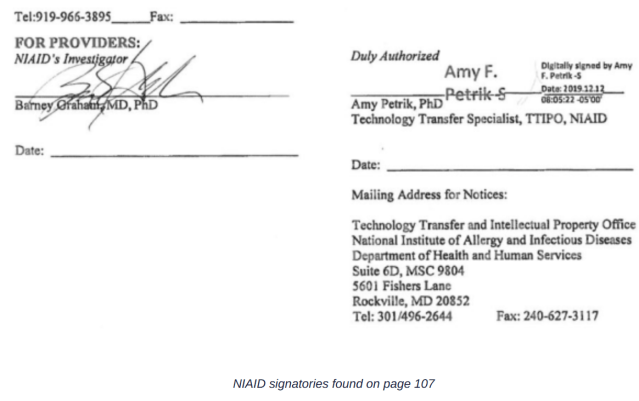 The agreement was also signed by two representatives of the NIAID, one of whom was Amy F. Petrik PhD, a technology transfer specialist who signed the agreement on December 12th 2019 at 8:05 am. The other signatory was Barney Graham MD PhD, an investigator for the NIAID, however, this signature was not dated.