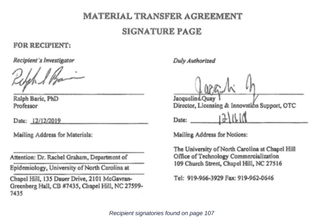 The material transfer agreement was signed the December 12th 2019 by Ralph Baric, PhD, at the University of North Carolina at Chapel Hill, and then signed by Jacqueline Quay, Director of Licensing and Innovation Support at the University of North Carolina on December 16th 2019.