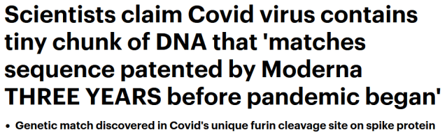On February 23 the Daily Mail ran an article showing that Moderna has patented the 19 base letter (nucleotide) sequence which codes for the Furin Cleavage site in Covid-19.
