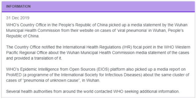 All of these signatures were made prior to any knowledge of the alleged emergence of the novel coronavirus. It wasn’t until December 31st 2019 that the World Health Organisation (WHO) became aware of an alleged cluster of viral pneumonia cases in Wuhan, China. But even at this point, they had not determined that an alleged new coronavirus was to blame, instead stating the pneumonia was of “unknown cause”.