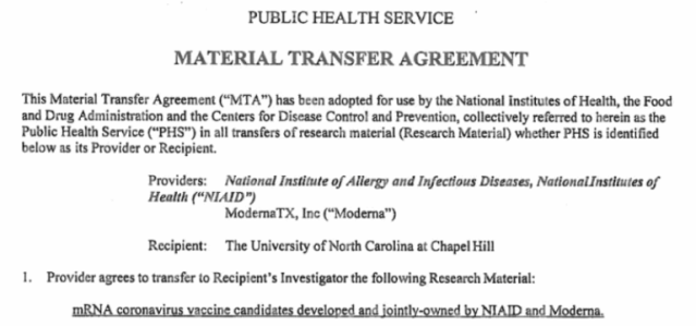 The confidential agreement which can be viewed here states that providers ‘Moderna’ alongside the ‘National Institute of Allergy and Infectious Diseases’ (NIAID) agreed to transfer ‘mRNA coronavirus vaccine candidates’ developed and jointly-owned by NIAID and Moderna to recipients ‘The University of North Carolina at Chapel Hill’ on the 12th December 2019.