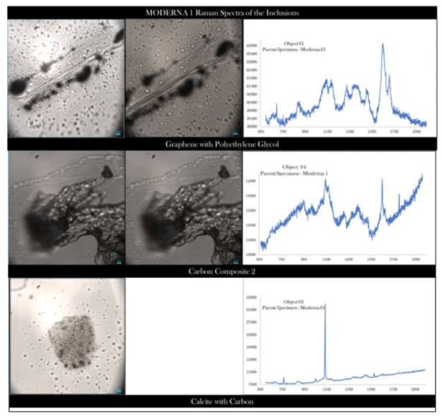 The first sample that was evaluated was the Moderna 01 which was examined by Raman spectroscopy. The investigation clearly showed that all the inclusions within the vaccine have a strong carbon signal with confirmed graphene compositions of some representative forms.