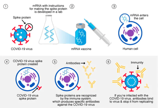 The mRNA in the vaccine provides instructions to the cells to produce a protein (called spike protein) that is found on the surface of the Covid-19 virus. When the immune system detects this spike protein, it can recognize it as foreign and mount an immune response against it,