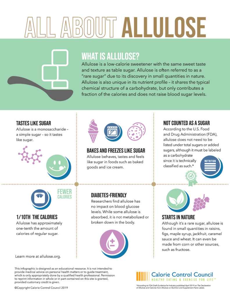 Allulose is different. When absorbed by the body, this simple sugar is not metabolized so it is nearly calorie-free and importantly, doesn’t raise blood glucose or insulin levels.