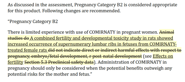 The pregnancy category was changed to ‘B1’, no line was included on the increased occurrence of supernumerary lumbar ribs in fetuses, and they instead included the line that was requested to be removed claiming “Animal studies do