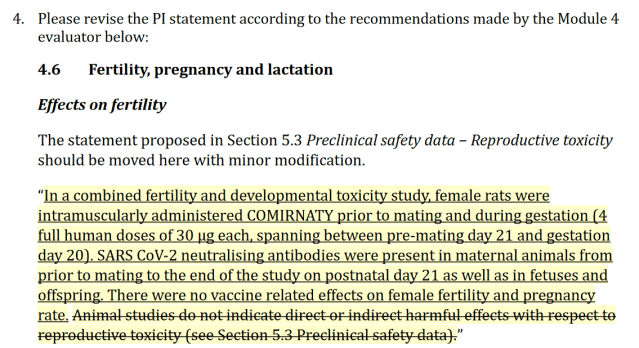 The Module 4 evaluator requested Pfizer remove their claim that “Animal studies do not indicate direct or indirect harmful effects with respect to reproductive toxicity”.
