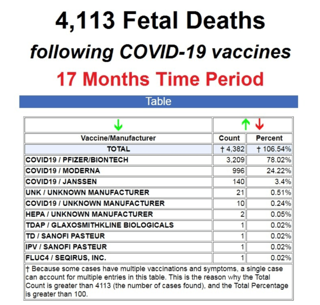 According to the Centers for Disease Control’s (CDC)) Vaccine Adverse Event Database (VAERS), as of 22nd April 2022, a total of 4,113 foetal deaths have been reported as adverse reactions to the Covid-19 injections, 3,209 of which were reported against the Pfizer injection.