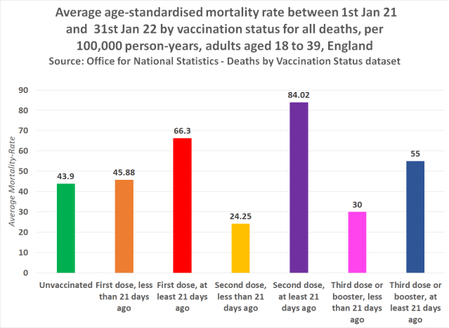 The following chart shows the average-age standardised mortality rate to have occurred between 1st Jan 21 and 31st Jan 22 by vaccination status for all-cause deaths, per 100,000 person-years among adults aged 18 to 39 in England –