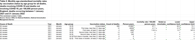 Table 2 of the dataset contains data on the monthly age-standardised mortality rates by vaccination status by age group for all deaths in England. The following table shows an example of how the numbers are presented in the dataset –