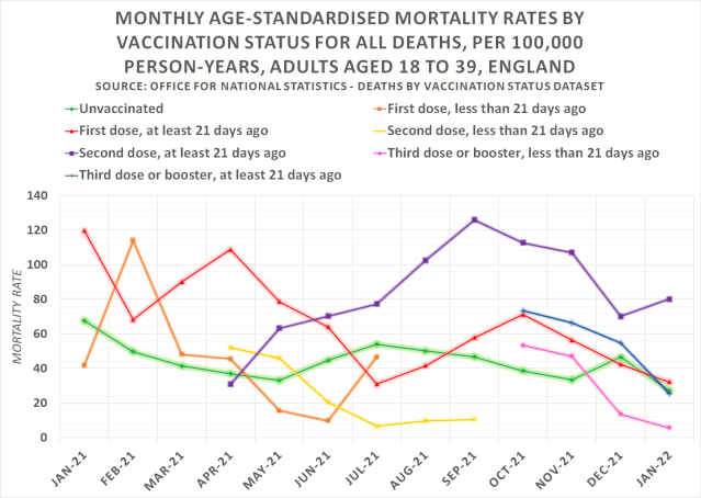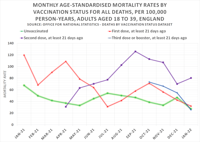 The above chart shows the monthly age-standardised mortality rates by vaccination status for all-cause deaths, per 100,000 person-years among adults aged 18 to 39 in England. The green line is the mortality rate among the unvaccinated, which while fluctuating has remained pretty stable throughout.