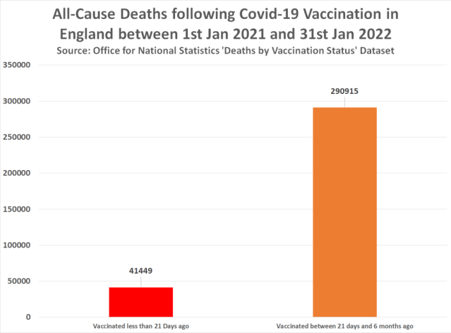 This may explain why figures found in ‘table 4’ of the same ONS dataset reveal 41,449 people died within 21 days of vaccination in England between 1st Jan 21 and 31st Jan 22 –