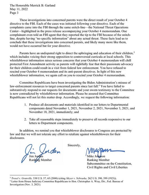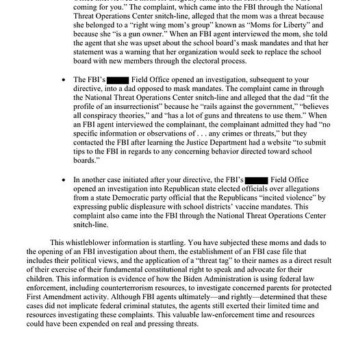 "This whistleblower information is startling," the letter continues. "You have subjected these moms and dads to the opening of an FBI investigation about them, the establishment of an FBI case file that includes their political views, and the application of a "threat tag" to their names as a direct result of their fundamental constitutional right to speak and advocate for their children."