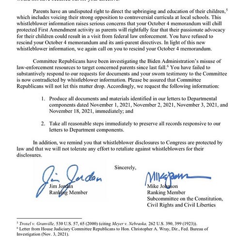 "This information is evidence of how the Biden Administration is using federal law enforcement, including counterterrorism resources, to investigate concerned parents for protected First Amendment activity."