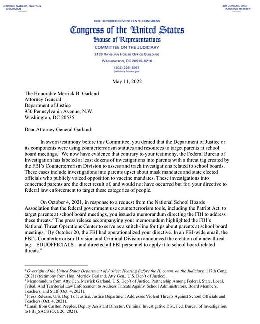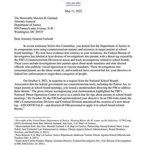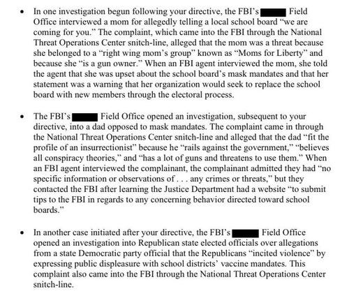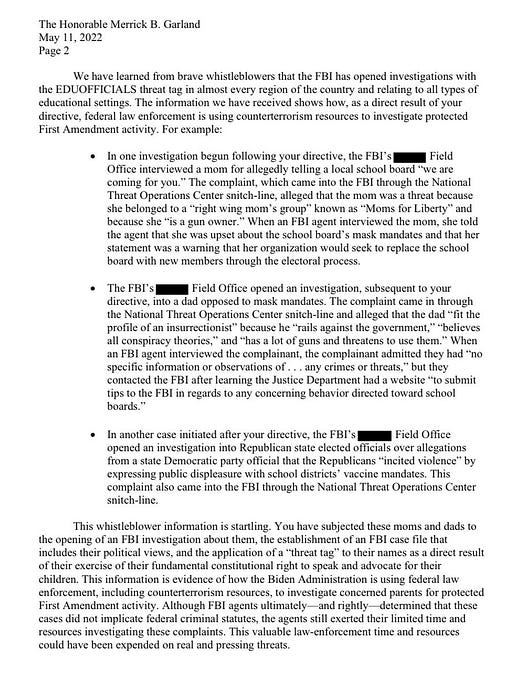 "We have learned from brave whistleblowers that the FBI has opened investigations with the EDUOFFICIALS threat tag in almost every region of the country," adding "The information we have received shows how, as a direct result of your directive, federal law enforcement is using counterterrorism resources to investigate protected First Amendment activity."