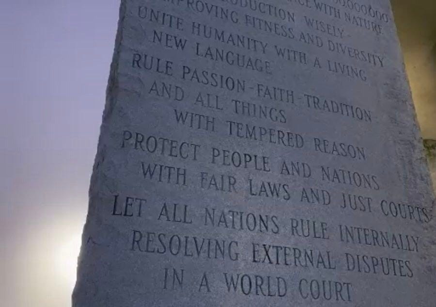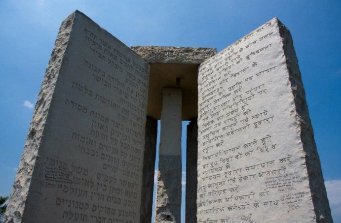 The monument calls for a New World Order with a vastly smaller human population living in harmony with nature.