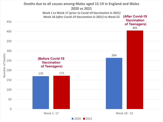 An investigation of UK Government data has revealed that there was a 53% increase in deaths deaths due to all causes among male teens aged 15-19 in the UK during 2021 after they were offered the Covid-19 injection.