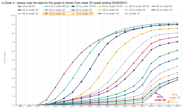 What we can see here is a clear spike in 3rd doses being administered to 18 and 19-year-olds, between weeks 49 and 51, as well as the start of 3rd doses being administered to 16 and 17-year-olds from week 49.