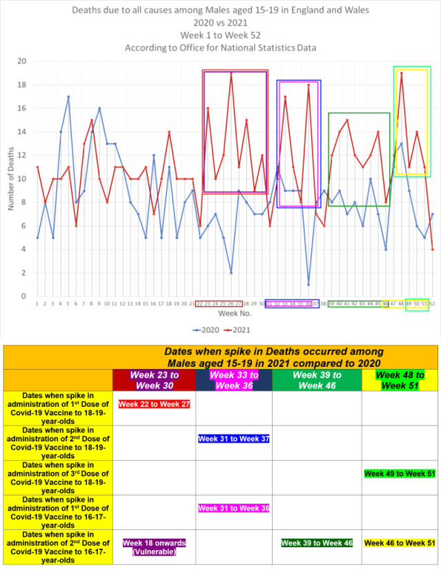 Government figures confirm male Teen Deaths increased by 53% in 2021 following COVID Vaccination & the Death spikes correlate with the uptake of each dose