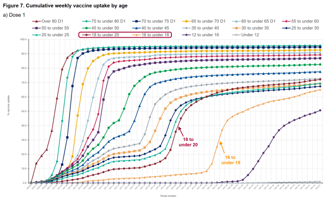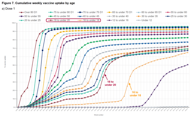 The reason the increase in deaths among male teens occurring from week 18 onwards is concerning is that according to the following chart provided by the UK Health Security Agency in the Vaccine Surveillance reports, this is the point where a spike in vaccinations of 18 and 19 year-olds began, and around the same time some 16 and 17-year-olds began to be given the Covid-19 injection.