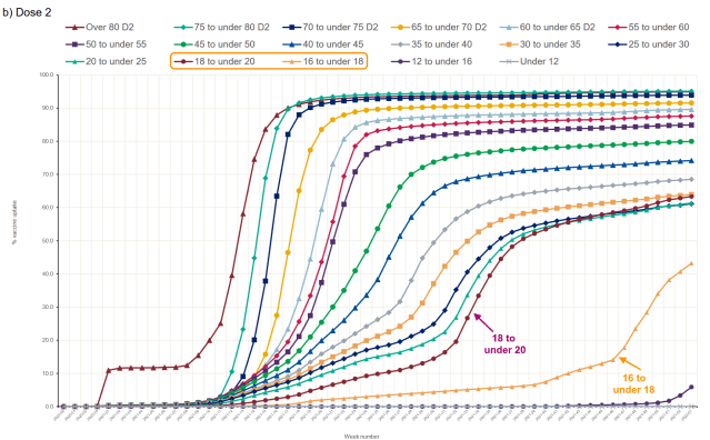 We can also see a clear spike in 2nd doses being administered to 16 and 17-year-olds between weeks 39 and 46, and between weeks 46 and 51.