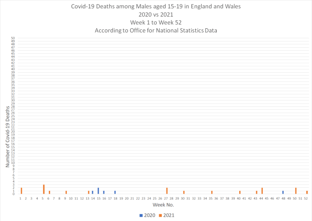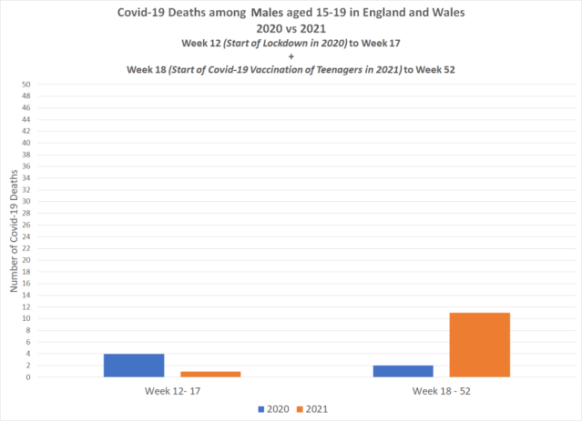 Between week 12 (start of Lockdown 1 in 2020) and week 17 in 2020 there were a grand total of 4 Covid-19 deaths among males aged 15-19 in England and Wales. During the same period in 2021, there was only a single death registered.