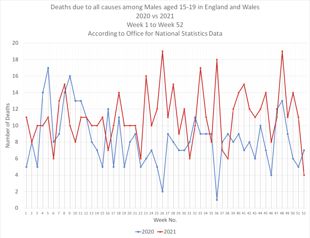 Overall, according to the ONS reports there were a total of 434 deaths due to all causes among males aged 15-19 in England and Wales between week 1 and week 52 in 2020. However, between week 1 and week 52 in 2021 there were a total of 577 deaths among males aged 15-19 in England and Wales.