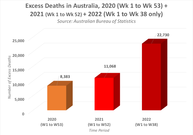 Australia suffered 11,068 excess deaths in 2021 and then a shocking 22,730 excess deaths by week 38 of 2022. This is in stark contrast to 2020, when only 1,306 excess deaths were recorded at the height of the Covid pandemic and prior to the rollout of the Covid injections.
