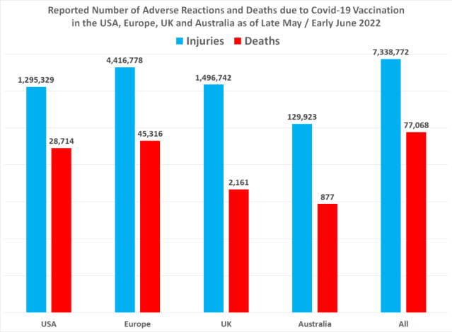 The latest reports released by medicine regulators around the world reveal that there have been at least 7.3 million injuries reported as adverse reactions to the Covid-19 injections up to late May and early June 2022, including 77,068 deaths (source).