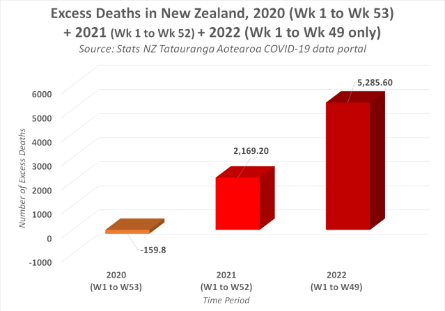 New Zealand suffered 2,169 excess deaths in 2021 and then a shocking 5,286 excess deaths by week 49 of 2022. These are shocking figures for the small island with an estimated population of 5 million people.