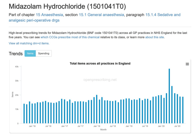 According to official data in April 2019 up to 21,977 prescriptions for Midazolam were issued, containing 171,952 items, the vast majority being Midazolam Hydrochloride. However in April 2020 45,033 prescriptions for Midazolam were issued, containing 333,229 items, the vast majority being Midazolam Hydrochloride.