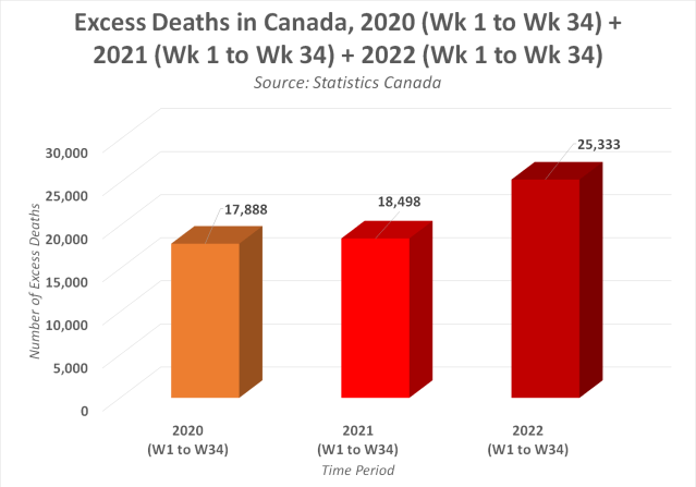 By week 34 of 2020, Canada had recorded 17,888 excess deaths. By week 34 of 2021, Canada had recorded 18,498 excess deaths. But by week 34 of 2022, Canada had recorded 25,333 excess deaths, representing a 42% increase on the excess deaths recorded in 2020, prior to the roll-out of the Covid-19 injections.