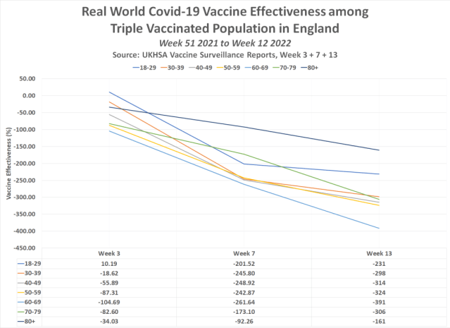 The following chart shows the Covid-19 vaccine effectiveness among the triple vaccinated population in England in the Week 3, Week 7 and Week 13 UKHSA Vaccine Surveillance reports of 2022 –