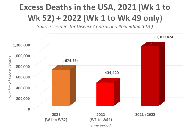 The USA suffered 674,954 excess deaths in 2021, and then 434,520 excess deaths by week 49 of 2022. This equates to over 1.1 million excess deaths in nearly two years.