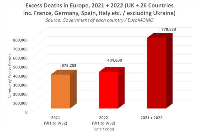 This equates to 779,853 excess deaths over the two years. The figures do not include Ukraine so cannot be blamed on the ongoing war.