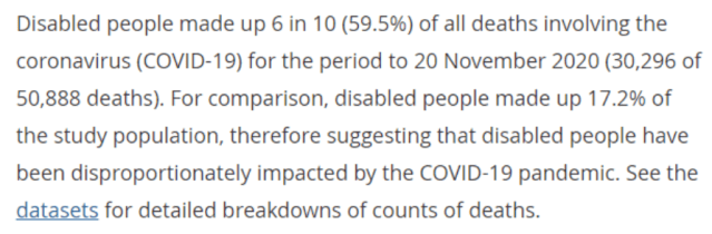 According to the UK’s Office for National Statistics, three in every five Covid-19 deaths occurred in those who suffered learning difficulties and disabilities (see here).