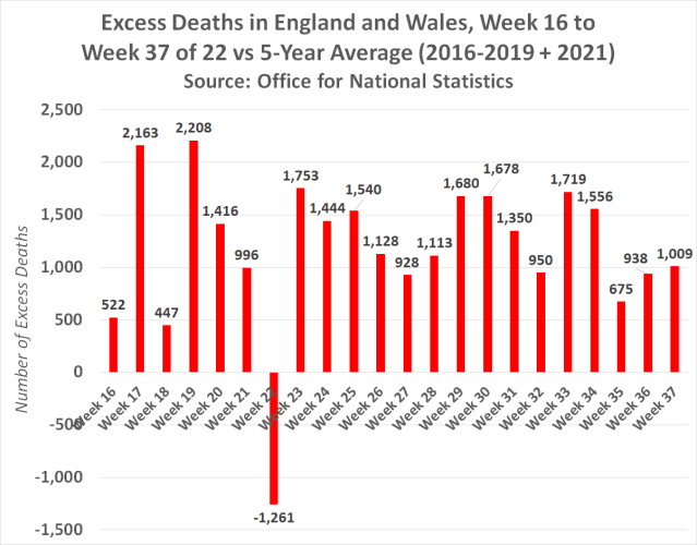 The following chart shows the number of excess deaths each week between week 16 and week 37 of 2022 compared to the five-year average –
