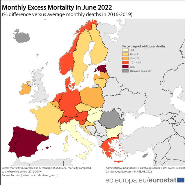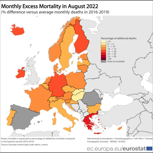 The following chart is taken from Eurostat’s website and was published on the 13th of October 2022. It shows excess mortality across Europe for the month of August –