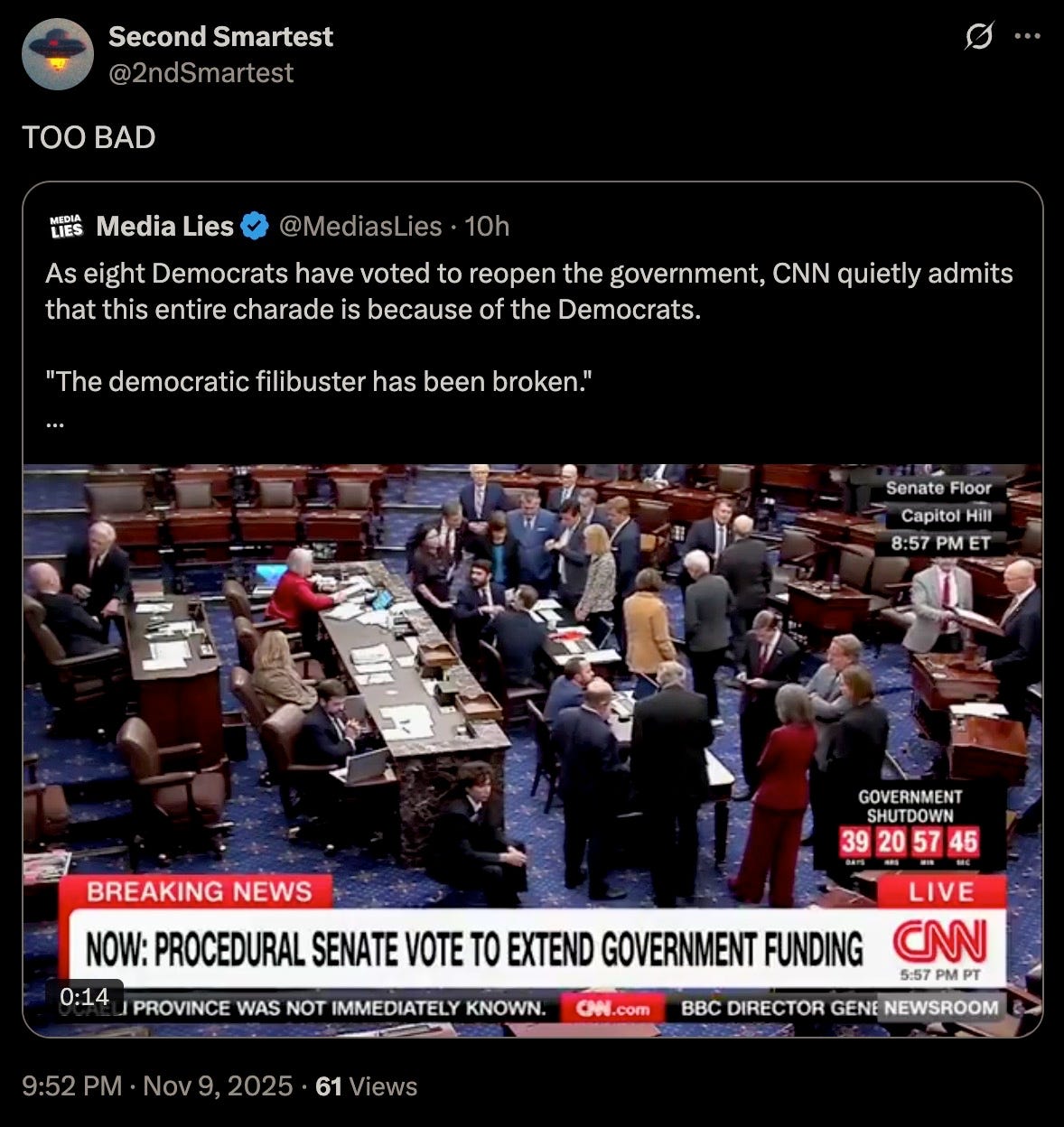GOVERNMENT SHUTDOWN ENDING: Republicans Receive Required 60 Votes to Reopen the Illegitimate Federal Government