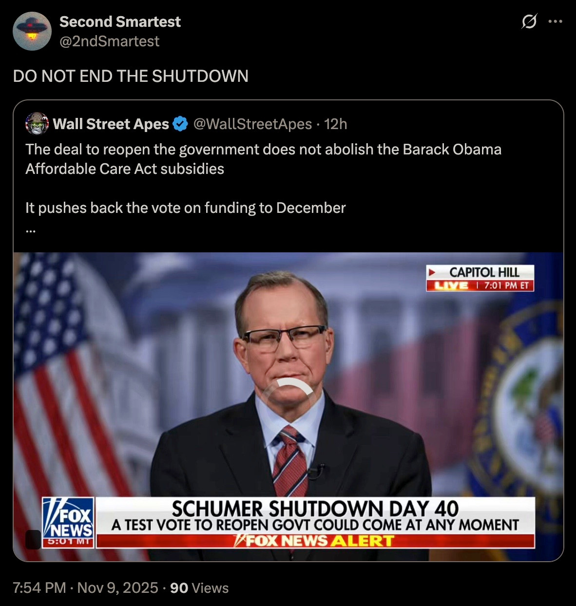So why conflate the $2k stimmy checks and the 50 year mortgage with the reopening of the Federal government? Because it is all interconnected, and the tax-debt-slave remains food for this illigimate Federal government, irrespective of whether it is shutdown or reopened.