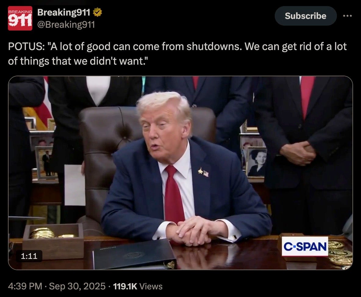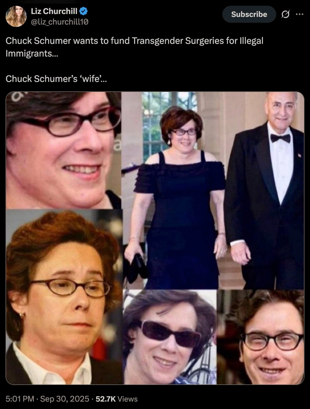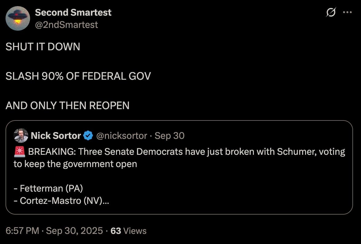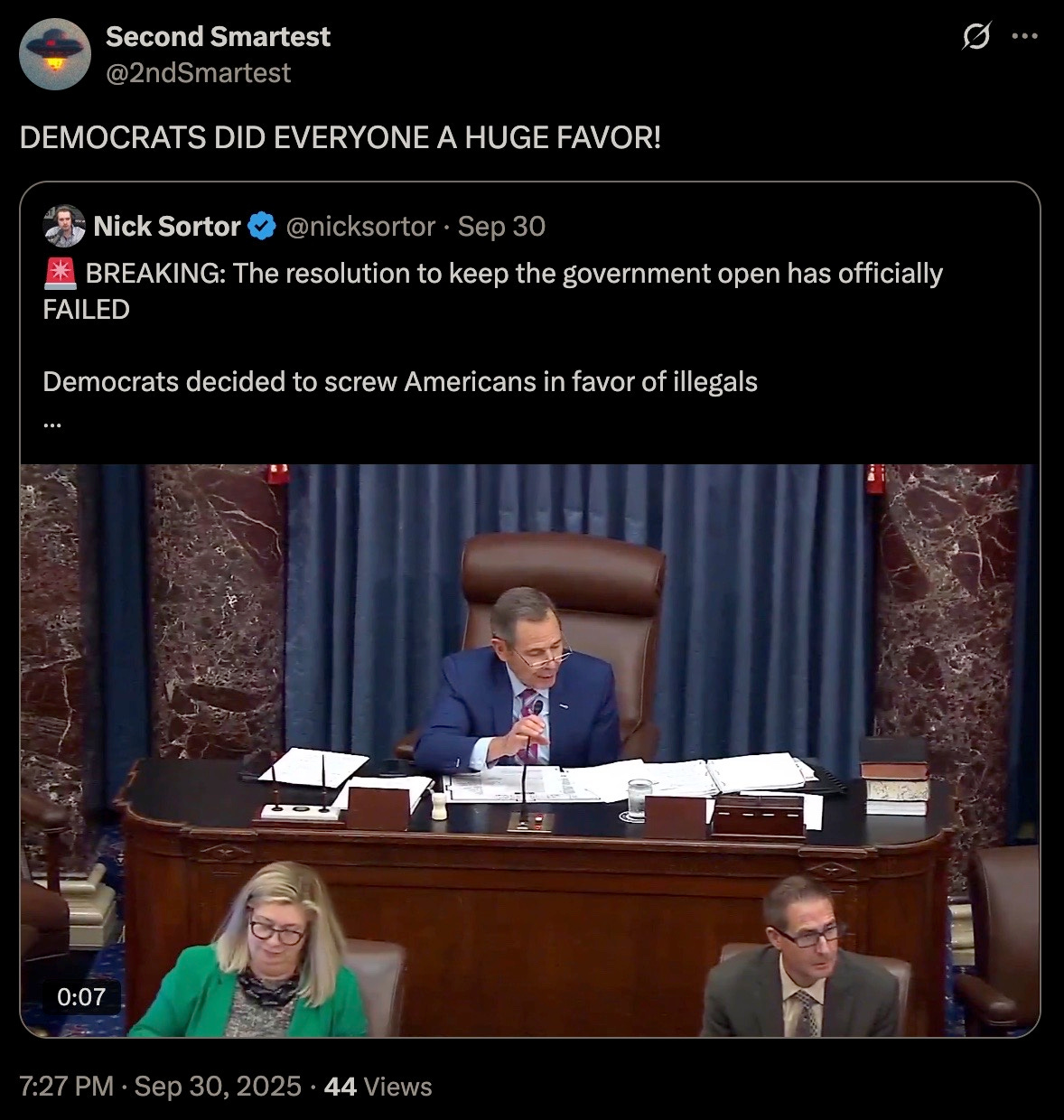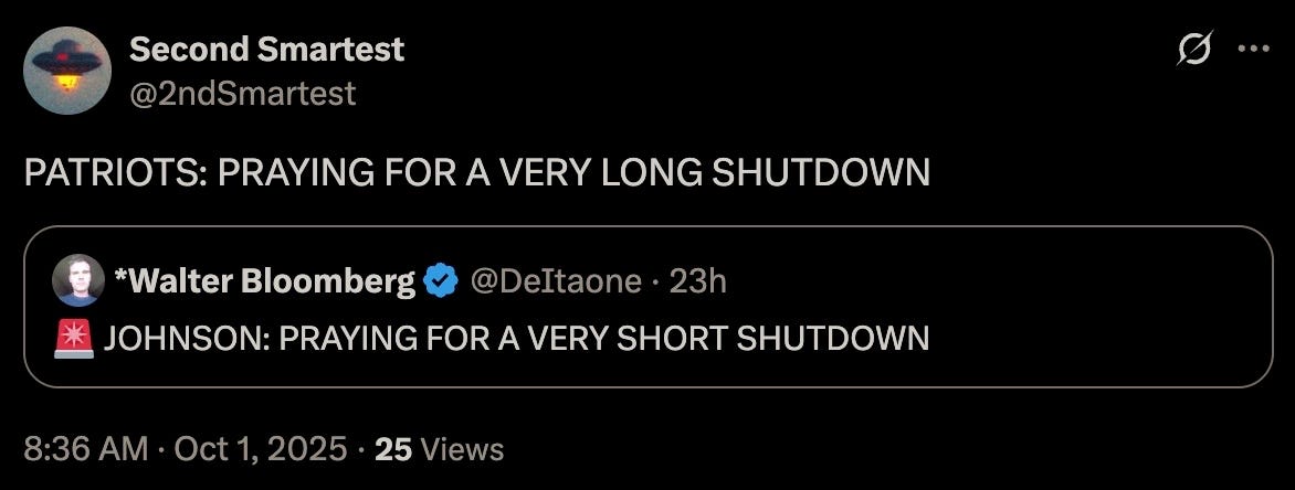 The rapidly metastasizing abomination that is the illegitimate Federal government has been shut down since yesterday due to democrats demanding $1.5 trillion in spending for illegal invader healthcare, child sex mutilation surgeries, and other deranged idiocy.