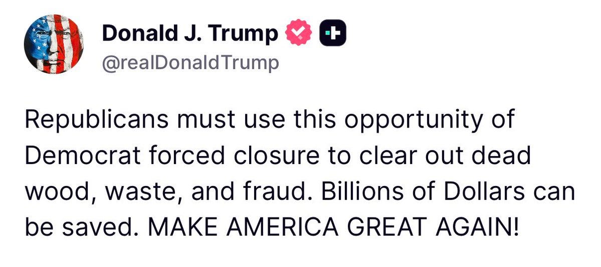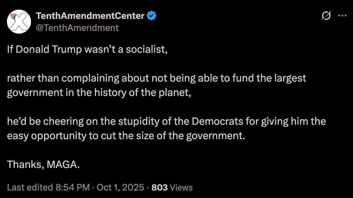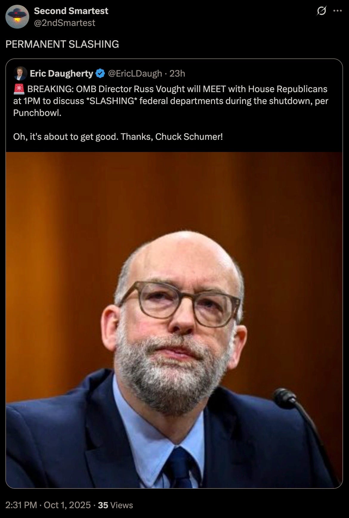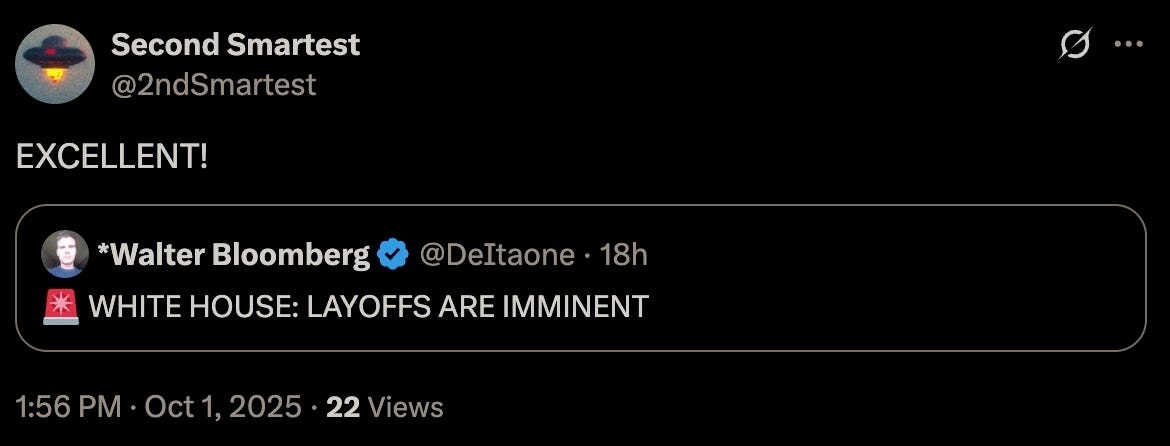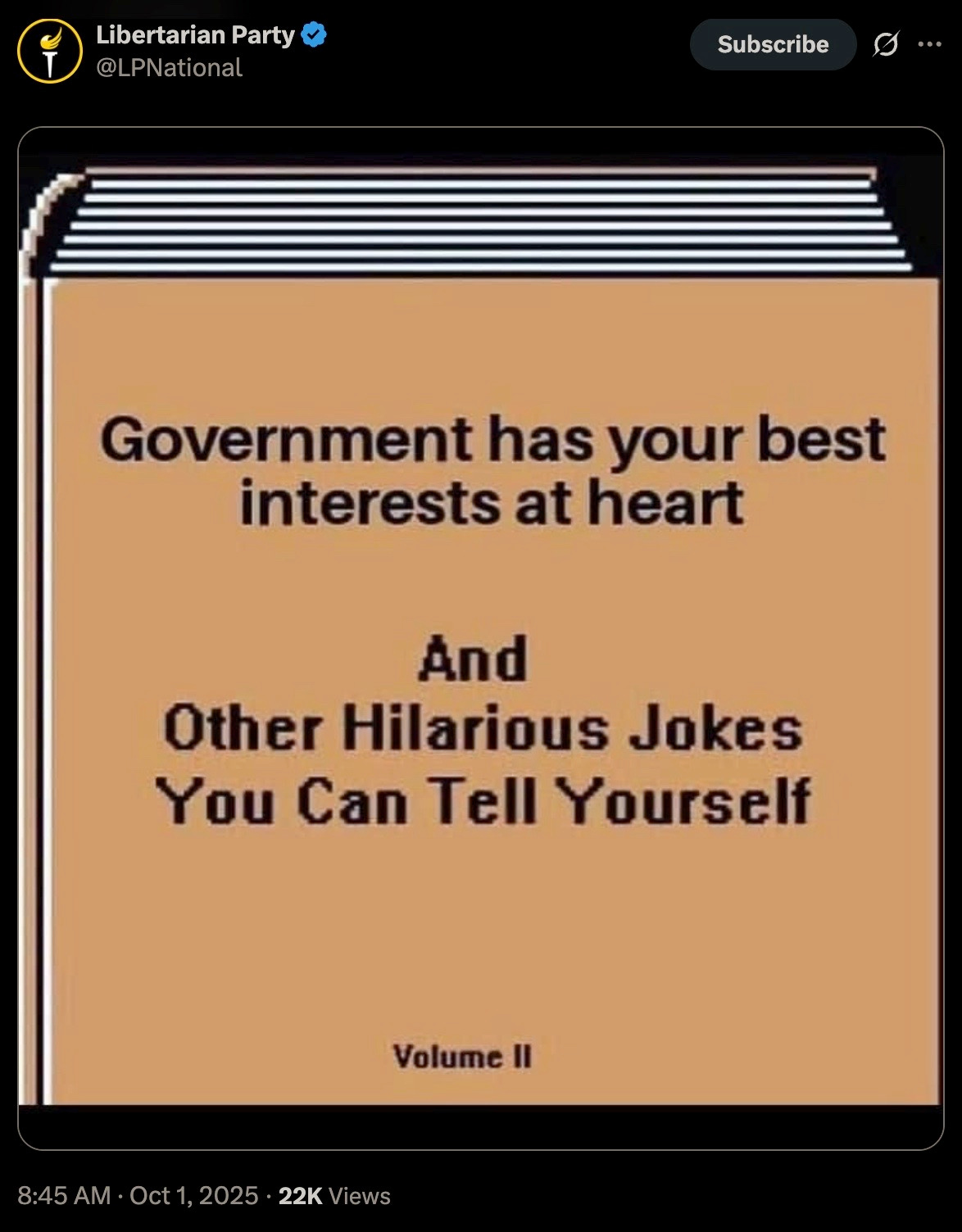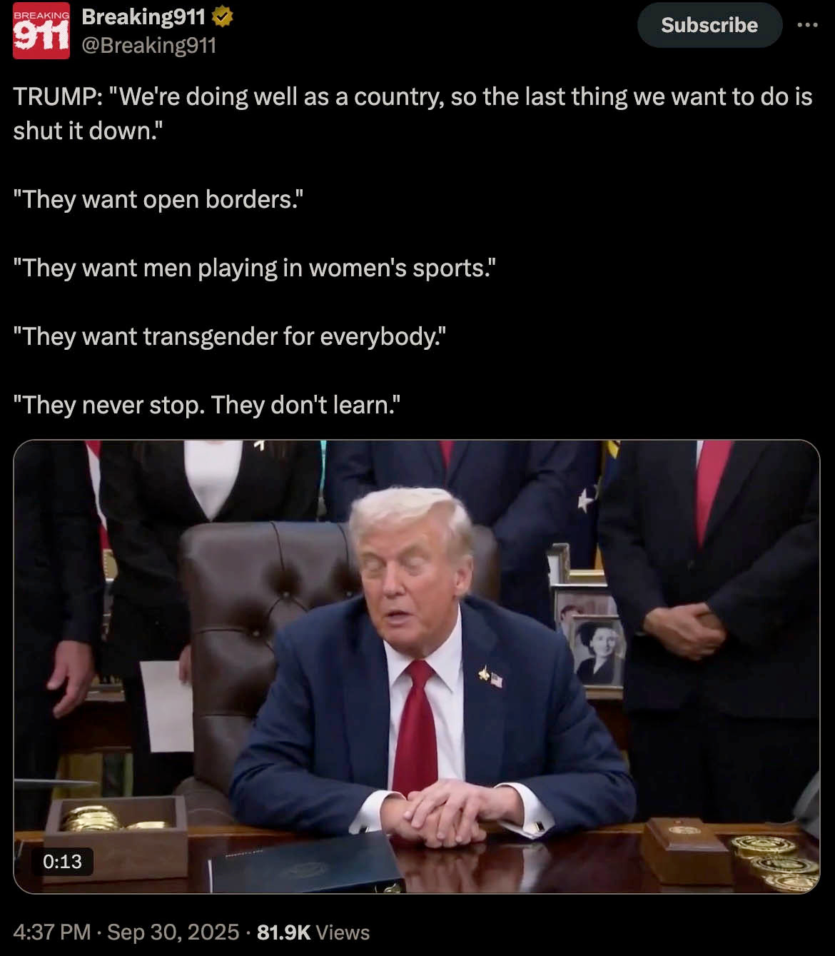 The rapidly metastasizing abomination that is the illegitimate Federal government has been shut down since yesterday due to democrats demanding $1.5 trillion in spending for illegal invader healthcare, child sex mutilation surgeries, and other deranged idiocy.