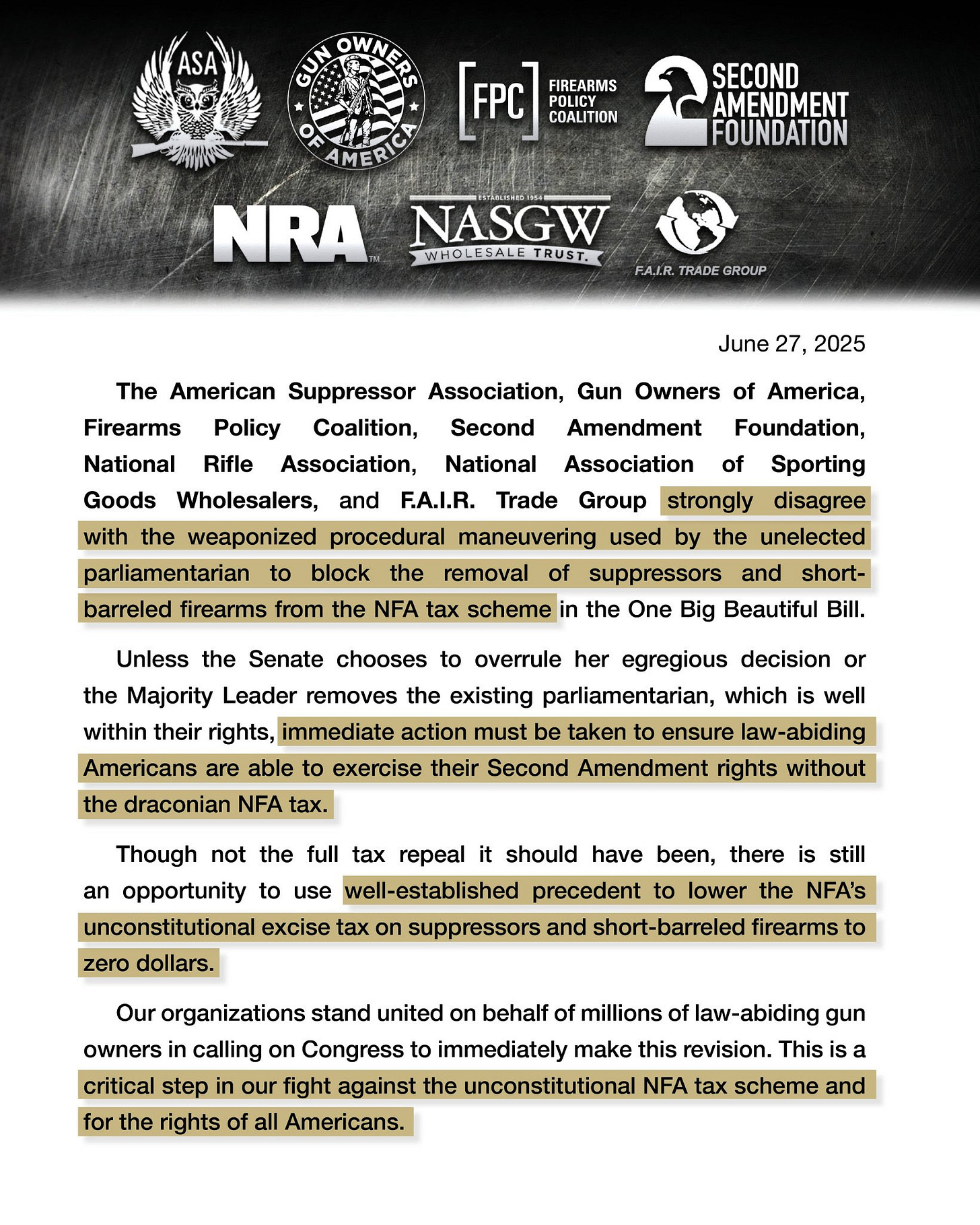 The seemingly pro-2A lobbying groups GOA, NRA, FPC, and 2AF made a deal last week with Senator John Thune which yielded to the Marxist Democrat parliamentarian by not abolishing the NFA, but, rather, by merely removing the subversive $200 tax on suppressors and SBRs.