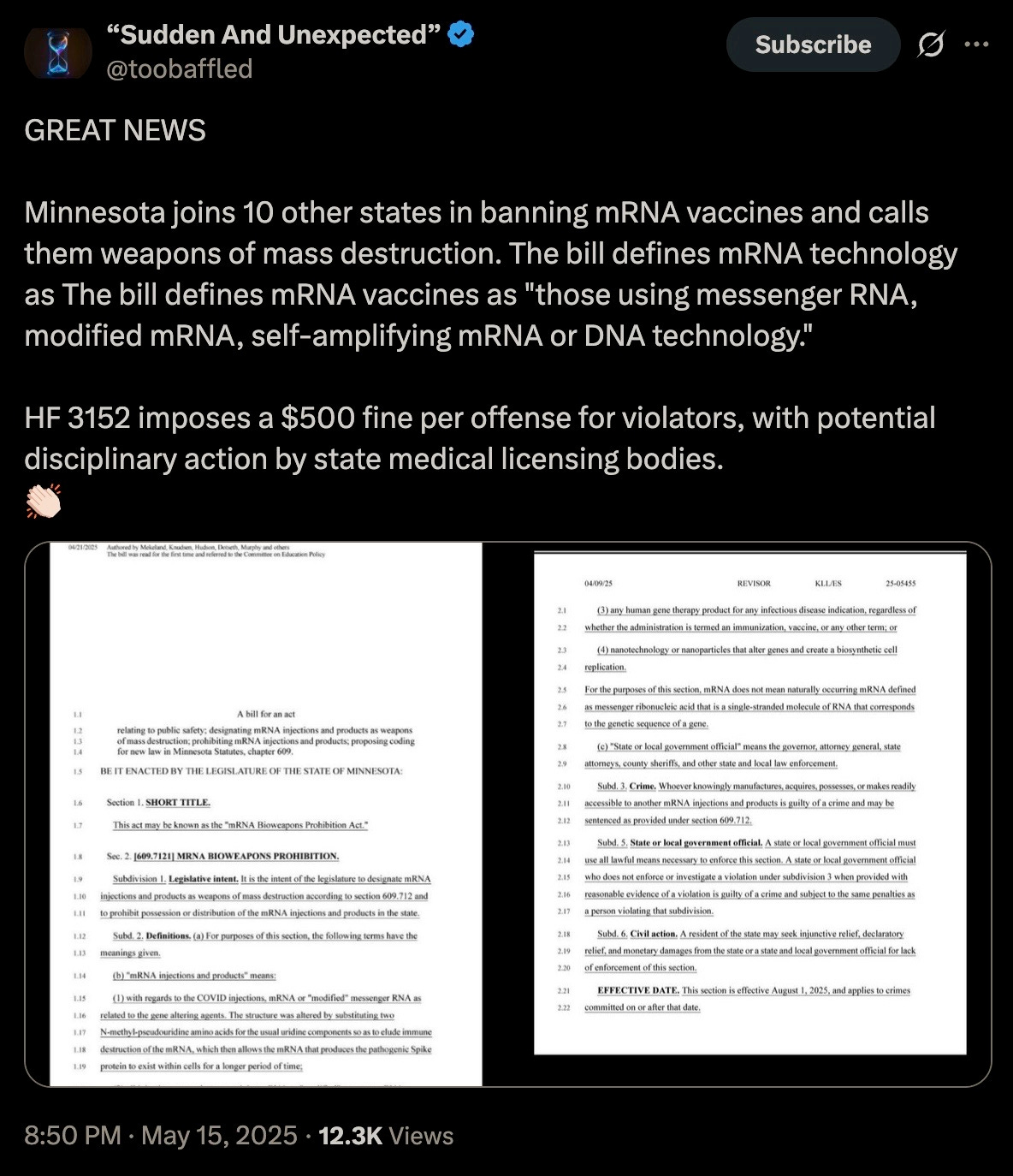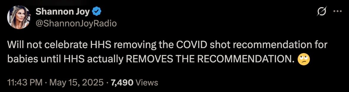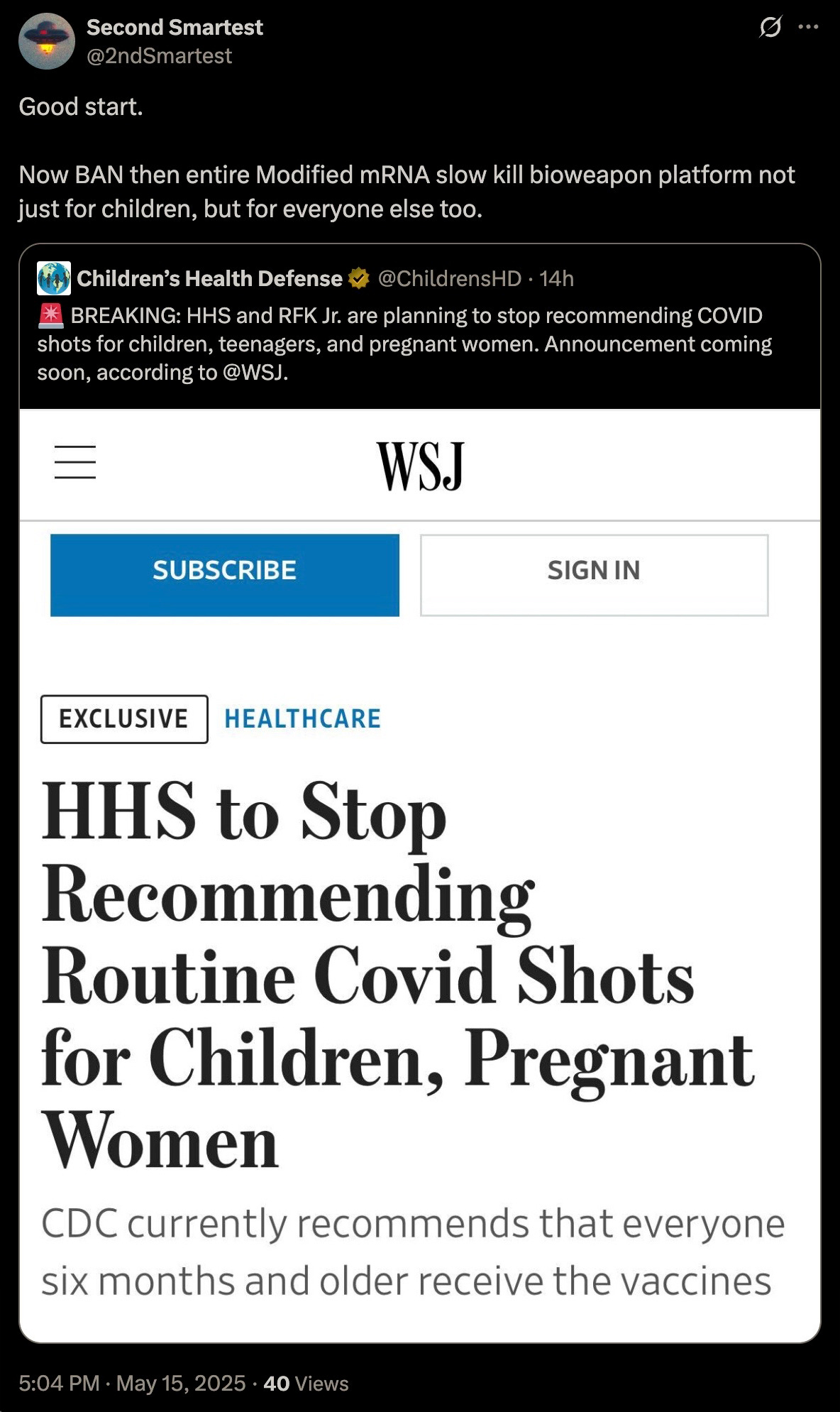 It’s really not good enough. They must indefinitely ban any form of mRNA jabs at all levels. Full stop. To say it is good news that HHS is recommending not taking poison, removing it from the childhood schedule blah blah, still leaves discretion for other levels of institutional capture to push these biological weapons. It’s grotesque.