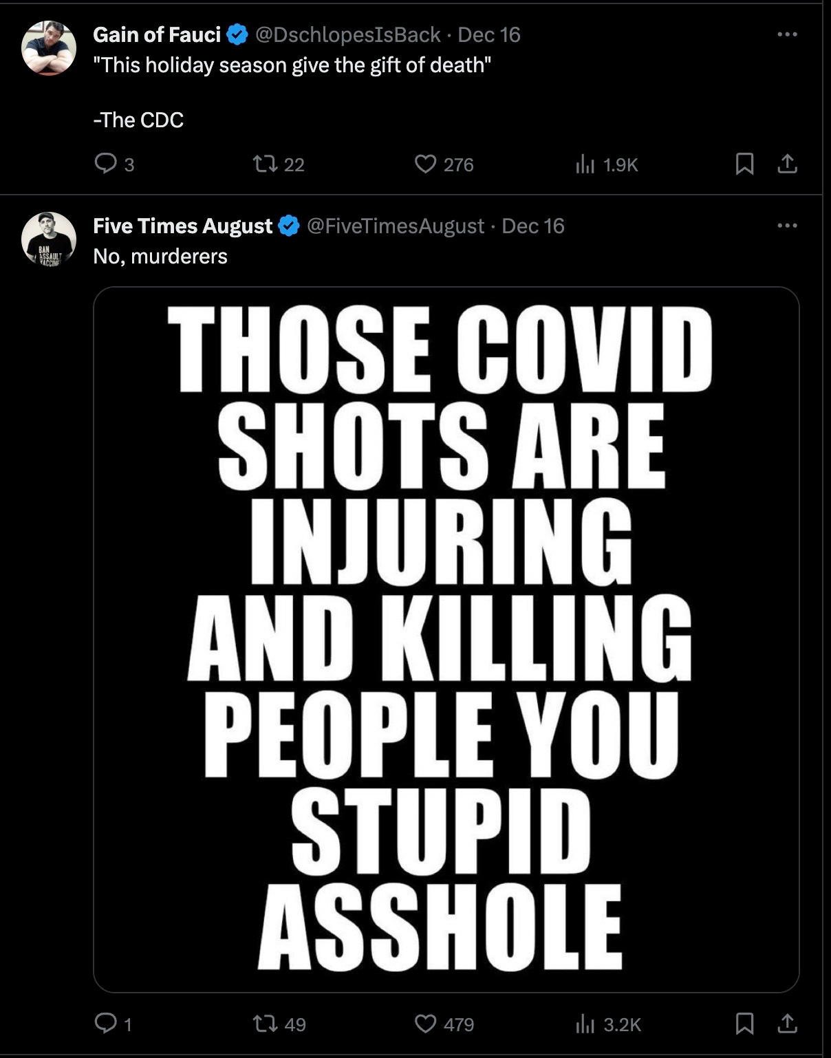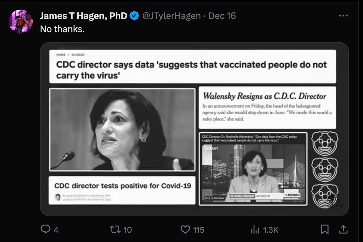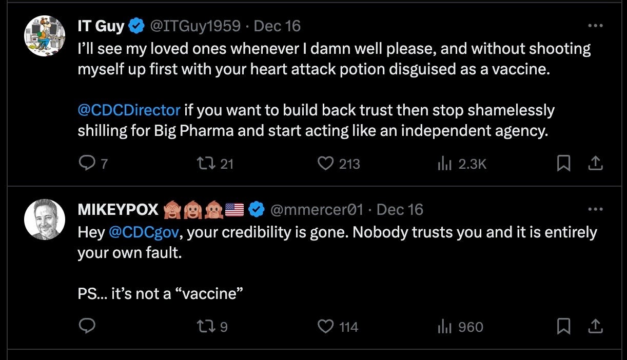With over a thousand replies, the above X post was highly ratioed: around 99% of the comments savaged the Center for Disease Crimes (CDC); here is a small sampling: